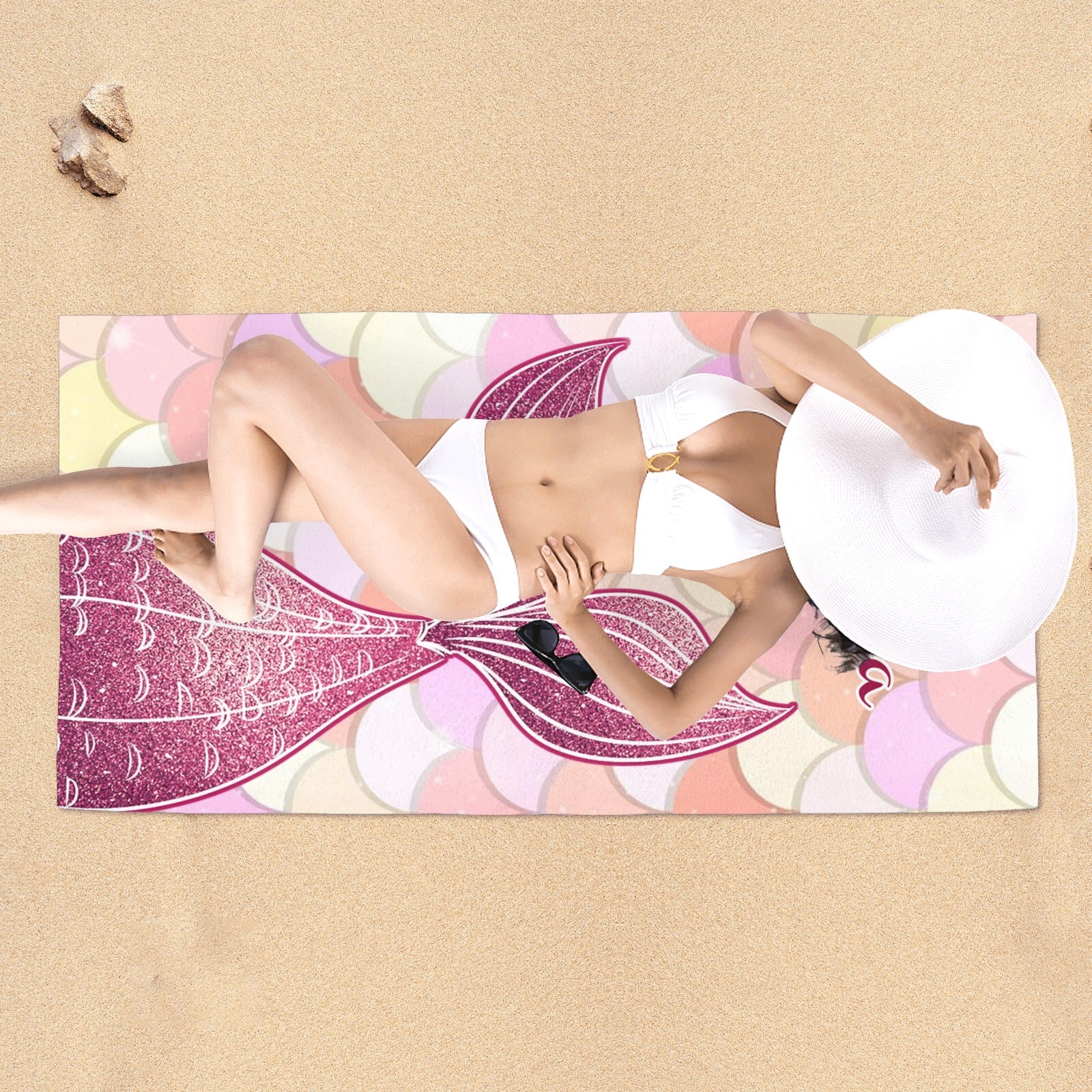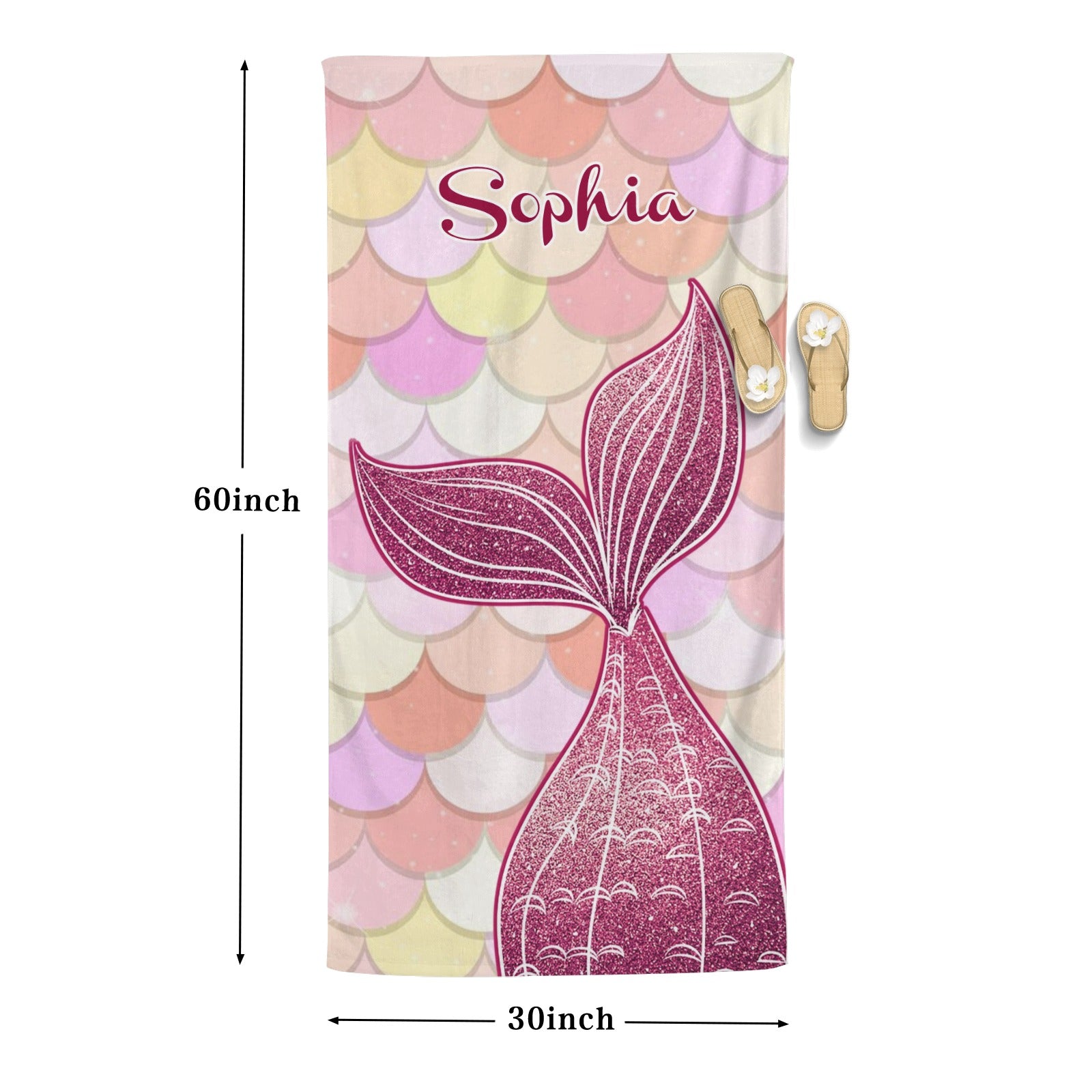 Red Mermaid Tail Beach Towel Custom Cotton/Poly Blend Pool Towel - Blue - Personalize with Your Name - Standard Size